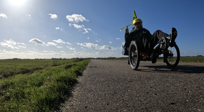 Mein Liegedreirad, zärtlich SCORPI genannt, ist von HP Velotechnik aus Kriftel bei Frankfurt. Die Modellbezeichnung lautet Sorpion FX. Es trägt mich sicher und gelassen durch die Landschaft, Städte und Dörfer.